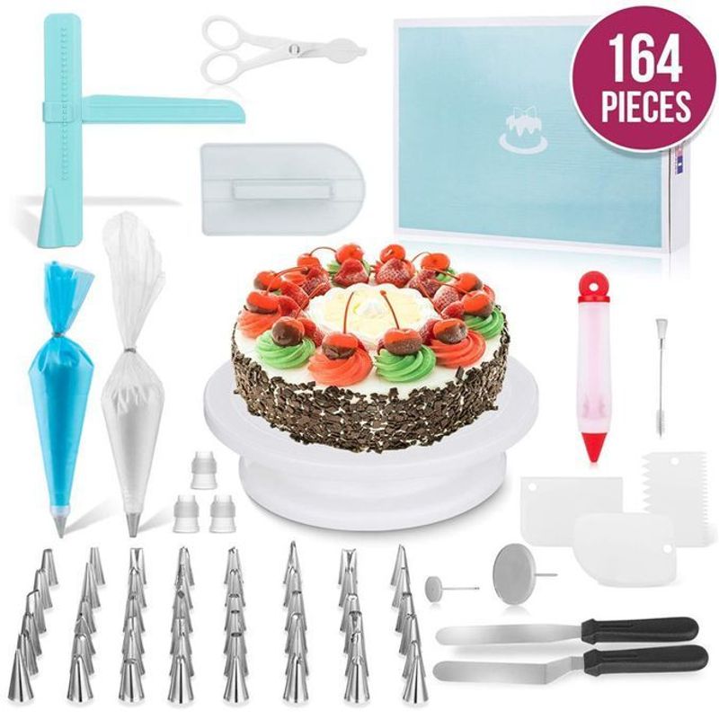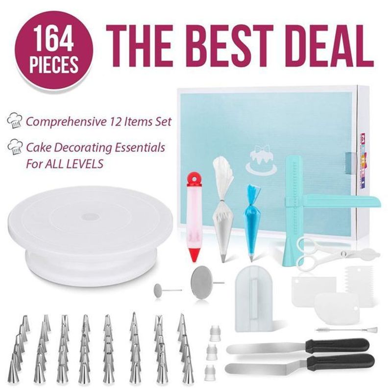 The kit includes:-1 cake turntable-1 curved spatula (27cm)-1 straight spatula (27cm)-48 piping nozzles-no marking-1 small decorative nail-1 large decorative nail-3 scrapers-1 double-ended brush-1Silicone decorative pen-3 converters-1 12-inch piping bag-2 smoothers-1 decorative scissors-100 disposable piping bags
