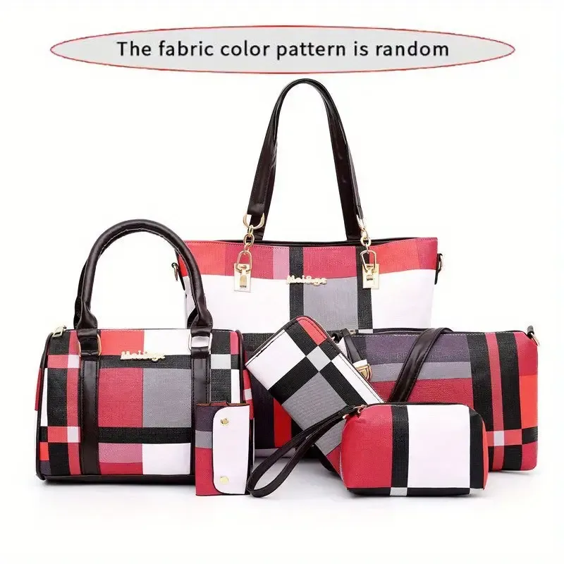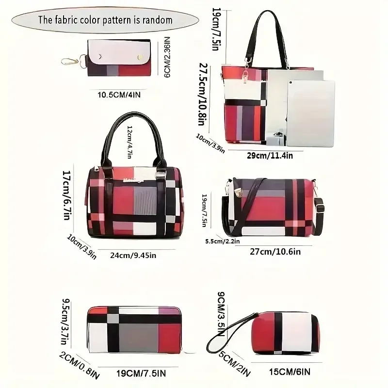 In summary, the 6pcs/set Large Capacity Shoulder Bag with Checkered Pattern and Multiple Functions is a must-have for any fashion-forward woman. Its stylish design, versatile functionality, and durable materials make it an essential addition to your accessory collection. Whether you need a spacious bag for daily errands or a chic clutch for a night out, this set has you covered. Embrace your style and enjoy the convenience of a bag set designed with your needs in mind. Invest in your accessory collection today and experience the perfect combination of fashion and function!