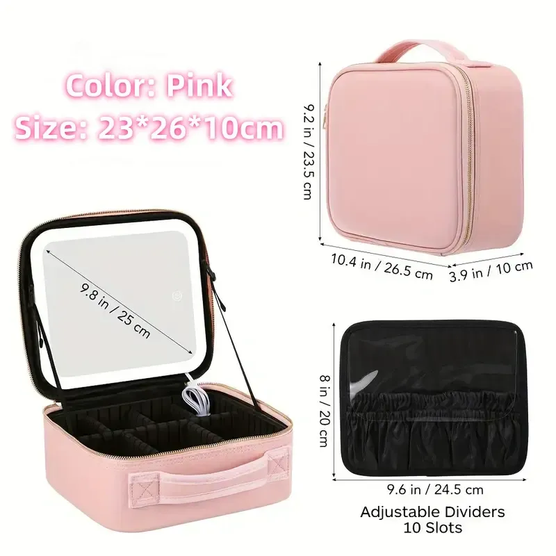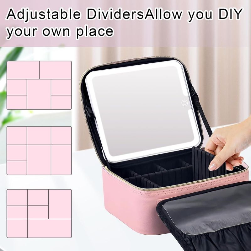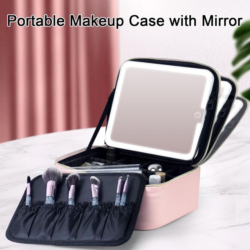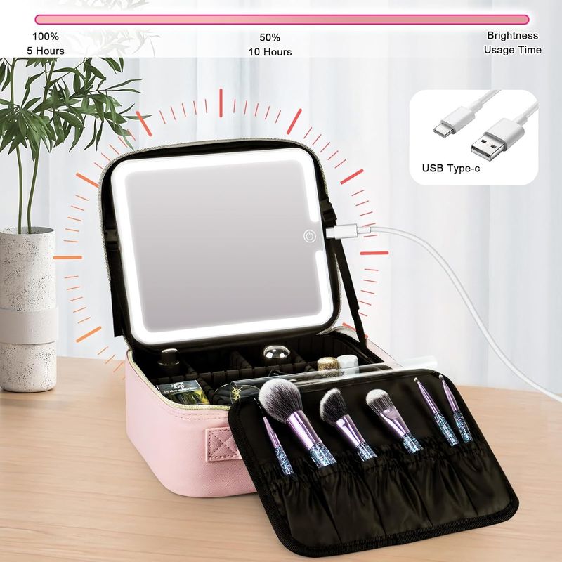 Our Travel Makeup Case with LED Light & Mirror Portable is made with premium vegan leather. It features a LED mirror with adjustable brightness of 3 settings, helping you to get ready for any occasion. It has a built-in, long-lasting battery life that only takes 4 hours to get fully charged and can last for a couple of days.